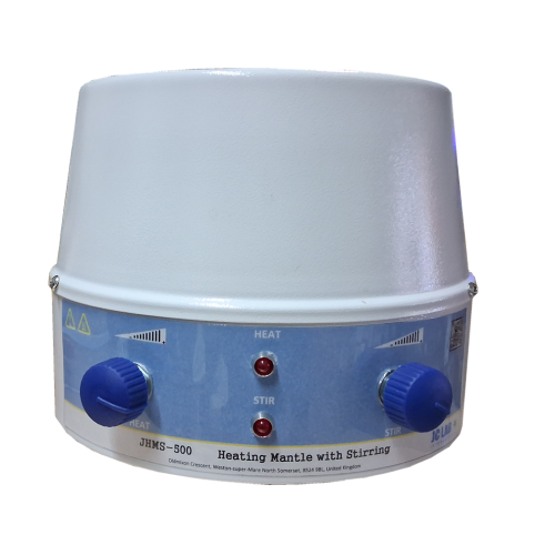 The JHMS Stirring Heating Mantle has the added functionality of stirring which widens the range of applications. Stirring operation is simply achieved by placing the correct size stir bar into the flask, turning the stir control to the minimum speed and ramping up slowly. If the magnetic coupling to the stir bar is lost for any reason, the stir speed control should be reduced slightly and the auto-recapture switch can be activated.