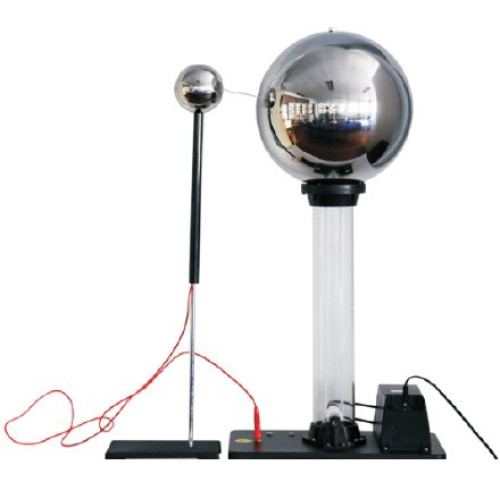 This large Van de Graff generator motor driven. Excellently constructed, the generator reliably delivers charge and sparks 10cm long and more immediately on setting it in motion, even under high humidity conditions. The generator is 76cm high and features a 28cm diameter polished steel sphere, which is less vulnerable to dents and scratches than comparably sized aluminum spheres. A further unique feature of this generator is a built-in lamp close to the bottom of the belt that delivers a small amount of UV light when turned on. This can be seen to increase the demand for motor power. A set of accessories is included. The generator measures 38cm x 23cm x 76cm.